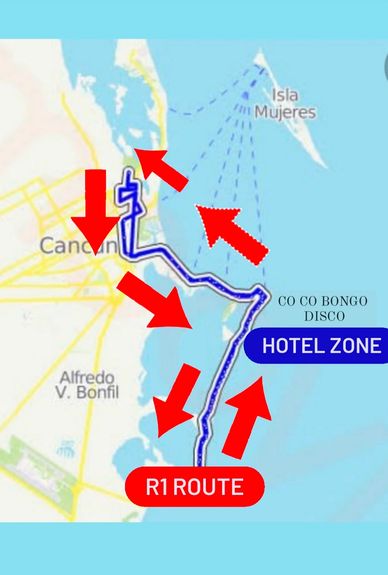 The R1 bus runs 24 hours a day, 7 days a week. It constantly circles from the very beginning of Cancun's hotel zone to the very end. This route includes all the major Resorts in the hotel zone, major restaurants, nightclubs, shopping, ferry dock and most marinas.